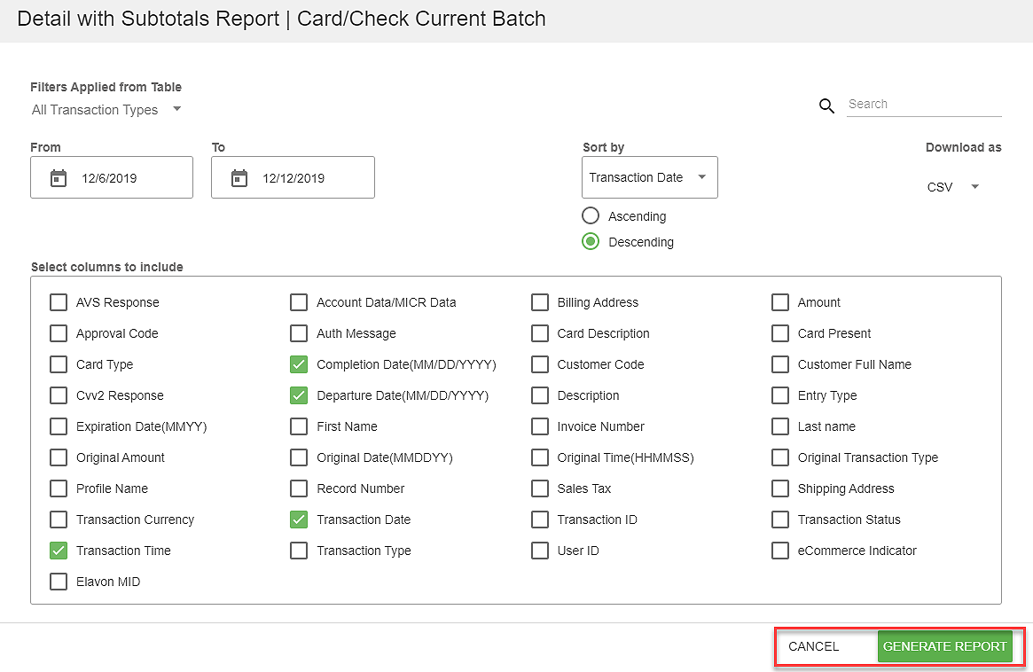 3. On the Detail with Subtotals Report screen, you must choose the Transaction Type, From and To dates, the Sort by type, and Select columns to include in your report. You can also use the Search field to manually search for a Detail with Subtotals Report. Be sure to choose the type of file you want to download by selecting CSV or XML under the Download as drop down menu. Select Cancel or Generate Report.